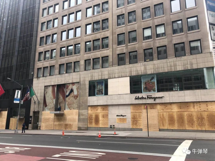 还配发了一张图,就是上面这张,豪华的第五大道大楼,门窗都关闭,尤其是临街的第一层,所有出入口和窗户,都用门板钉死了。