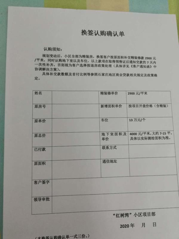 2016年10月18日,张先生认购了位于石家庄鹿泉区的汉邦红树湾小区一套住房,面积101.7平方米,当时售价约6400元/平方米,总价为660150元。在支付了21万元首付后,张先生与开发商石家庄汉邦房地产开发有限公司签了一份《认购协议单》。