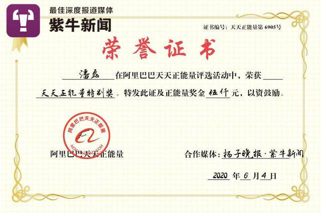 6月4日,阿里巴巴天天正能量联合扬子晚报,授予潘磊医生特别奖,奖励5千元正能量奖金。