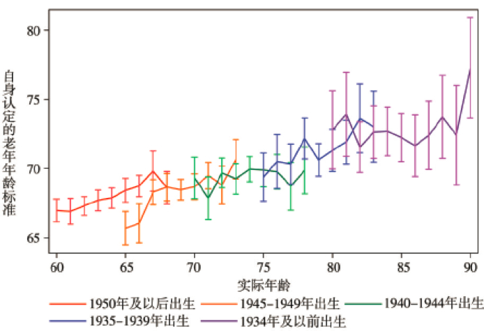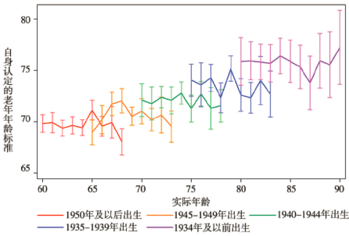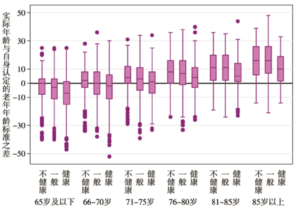 这可能是随着年龄的增加,老年人对于更高的年龄有了亲身体验和新的认识,因此也改变了对老年年龄标准的看法。但研究还发现了一个有趣的现象,对于同一个出生队列的老年群体来说,随着年龄的增加,