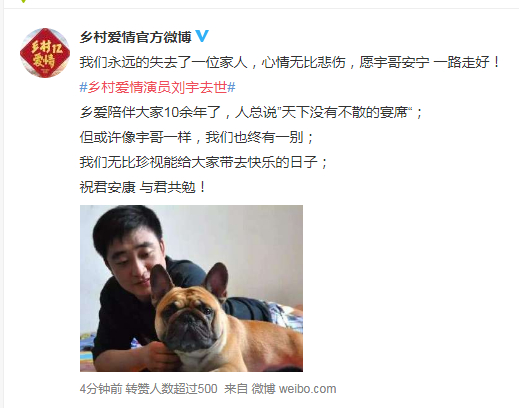 6月5日,网络上突然传出消息,曾在《乡村爱情》中出演技术员一角的演员刘宇去世。红星新闻记者从刘宇的朋友李犇处证实,刘宇平常身体健康,因突发心梗于5月27日上午在其沈阳家中去世,年仅38岁。