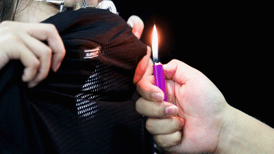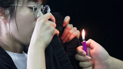 举着素湃休闲裤,对着打火机,轻轻一小口就吹灭了!