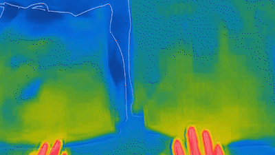 咱们能清晰的看到,只过了短短的几秒钟,素湃裤子(左)上手的热度已经散的差不多了。