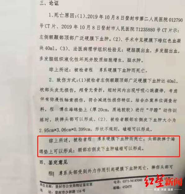此前,登封市公安局物证鉴定室的鉴定结论为,程某博系硬膜下血肿而死亡,头部跌摔于海绵垫上可以形成;额部右侧皮下血肿磕碰可以形成。
