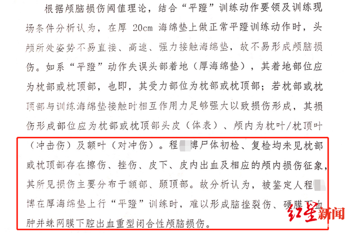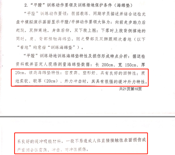 新的司法鉴定意见书则称,该类海绵垫质地柔软、较厚,外力冲击时,有很强的缓冲外力特性,系良好的缓冲吸能材料,在海绵垫做“平蹬”训练时,难以形成脑挫裂伤、硬膜下血肿并蛛网膜下腔出血重型闭合性颅脑损伤。