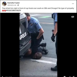 弗雷泽的脸书账号显示,当地时间5月26日,她上传了弗洛伊德遭警察跪压颈部的视频片段。随着视频的快速传播,来自各方的质疑声,也深深伤害了她。很多人批评弗雷泽“为何除了拍下视频什么都没做”。还有人告诉她,她本应该做更多事帮助弗洛伊德,例如制止警察。