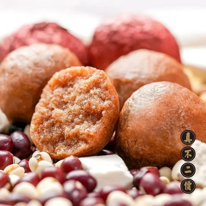 胡庆余堂研制的红豆薏米丸融汇了八大天然谷物食材,红小豆、薏米、腰果、花生、核桃、红枣、山药、茯苓。