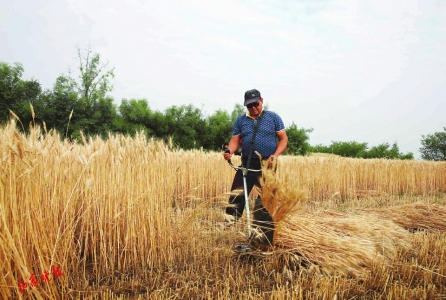 3.麦农用改装的割草机收割小麦。