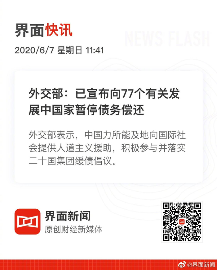 外交部:已宣布向77个有关发展中国家暂停债务偿还