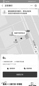 本以为,从这里骑走的车回到这里就能还了,但杨女士的手机上依旧提示让她去停车点还车,否则就要收取跨区域调度费。“当时已经晚上8点左右了,我实在不想折腾了,就交了15元的跨区域调度费。”她说,就这样,不到10分钟的路程,杨女士花费了9元的骑行费用和15元的非定点还车费。“说实话,真不如我一开始就打车回家呢。以为很方便的,谁知道还车这么麻烦。”