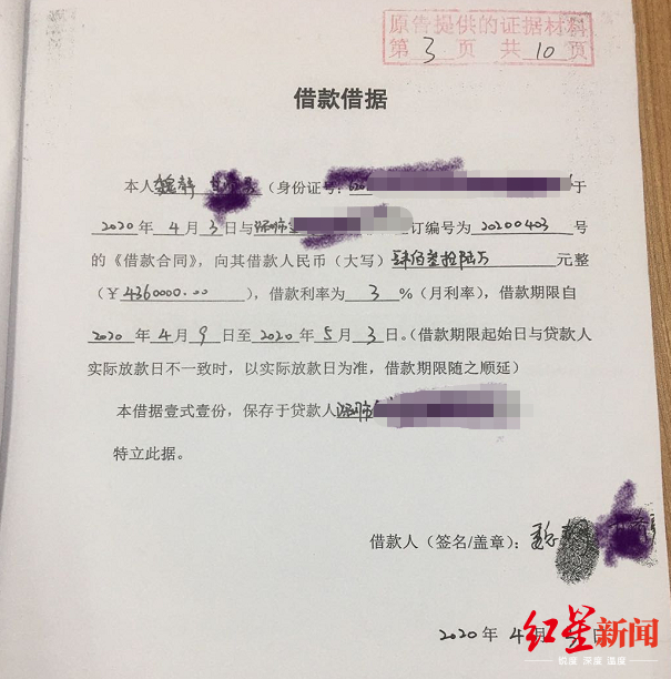 魏静发来的与这家小贷公司的借款合同及借款借据上,红星新闻记者看到,借款金额为436万,期限是2020年4月9日至5月3日。