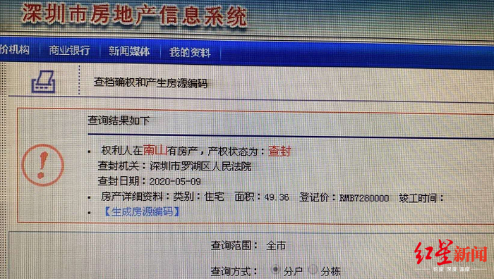 深圳市房地产信息系统查询系统显示,这套面积约49平米,登记价728万的房产被罗湖区法院查封