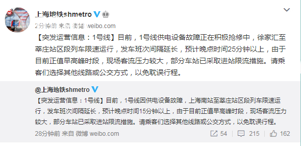8点50分,官微再消息称,1号线供电设备故障正在积极抢修中,徐家汇至莘庄站区段列车限速运行,发车班次间隔延长,预计晚点时间25分钟以上,由于目前正值早高峰时段,现场客流压力较大,部分车站已采取进站限流措施。请乘客们选择其他线路或公交方式,以免耽误行程。