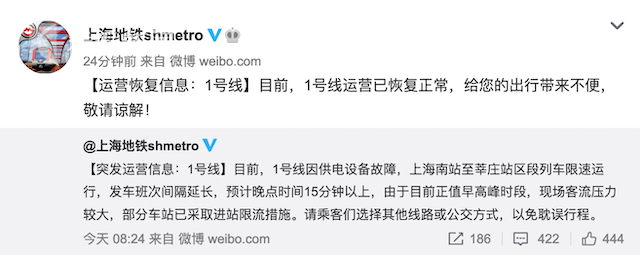 8点37分,上海地铁官方微博发布了盖有公章的致歉信:1号线故障,受影响乘客可通过上海地铁官网运营专页获取电子版致歉信。