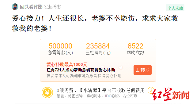 红星新闻注意到,截至发稿前,叶先生通过水滴筹平台已为妻子筹款23万余元,急需筹款金额为50万元。叶先生表示,希望能够得到更多爱心人士的帮助,如果筹款有剩余将退还捐款人。