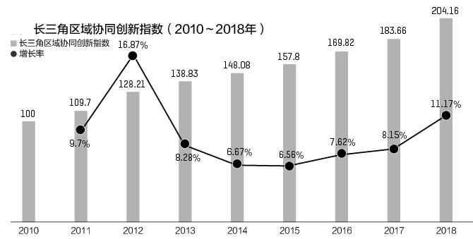 报告显示,近年来长三角区域协同创新总指数得分从100分(基期)增长至204.16分,较2010年翻一番。