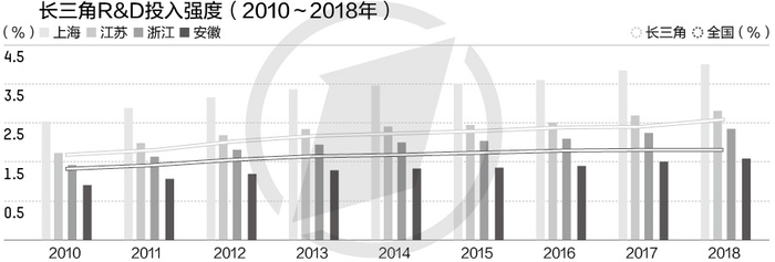 在研发投入方面,长三角研发经费投入显著提升。2018年长三角总体R&D投入强度为2.81%,高于全国的2.14%。