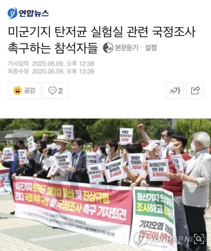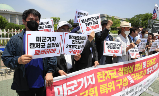 9日,“韩美不平等驻军地位协定(SOFA)修改国民联带”等市民团体在韩国国会前召开记者会,敦促“立即关闭威胁国民安全的美军炭疽菌等细菌实验室”。他们表示,最近媒体对驻韩美军在基地内设立细菌实验室的曝光使国民忧心忡忡,愤怒不已。驻韩美军为细菌实验室以及细菌实验项目公开招聘雇员,显然违反了《禁止生物武器公约》,无异于将韩国打造成危险的细菌实验室。