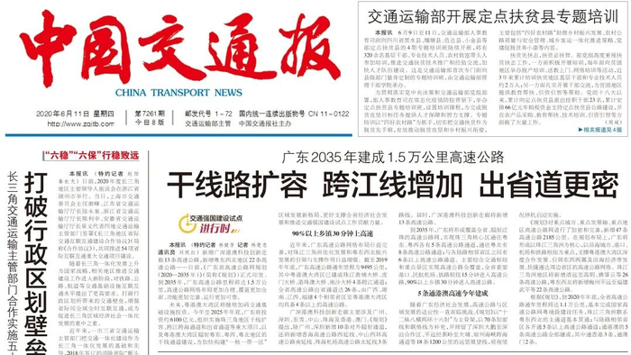 6月11日,《中国交通报》头版头条刊登了《广东2035年建成1.5万公里高速公路干线路扩容跨江线增加出省道更密》的文章,广东未来15年高速规划再获关注。
