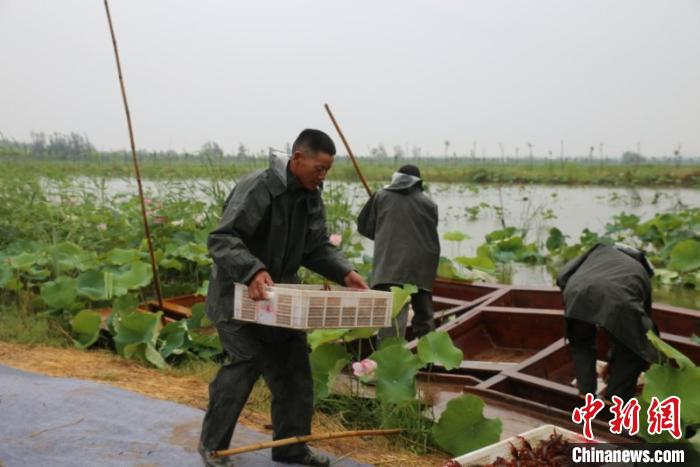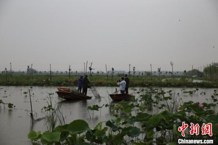 当日上午10时左右,淅淅沥沥的小雨落到荷叶上汇聚成珠,渔民们撑杆摇船,穿过密密层层的荷花、荷叶,起笼捕捞。中共鱼台县委宣传部供图