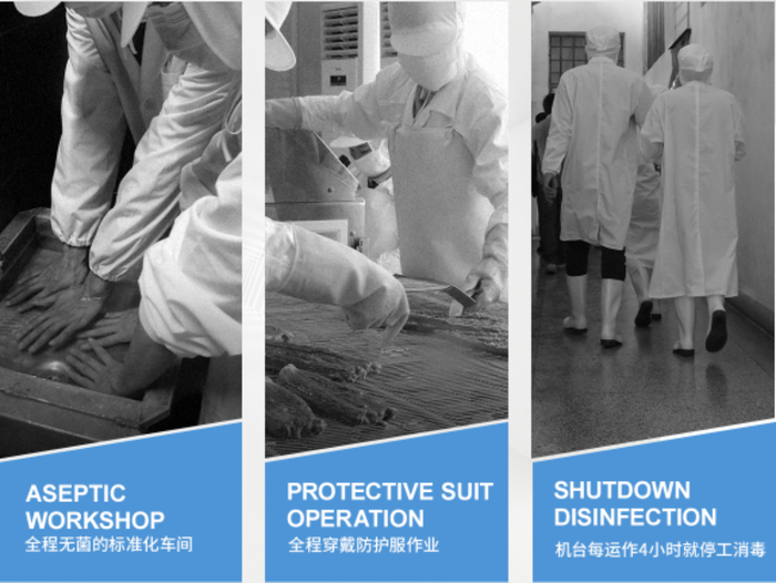 机台每运转4个小时就要停机1次对生产环节及生产车间进行全方位清洗消毒,消毒完毕后才可继续生产,全面把控生产环境的卫生确保生产质量。
