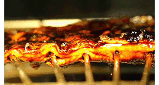 鳗鱼烤制完毕以后涂抹上浓浓香甜的酱汁,此刻,酱汁在鳗鱼上发出吱吱的声响,再搭配上晶莹剔透的上等米饭。