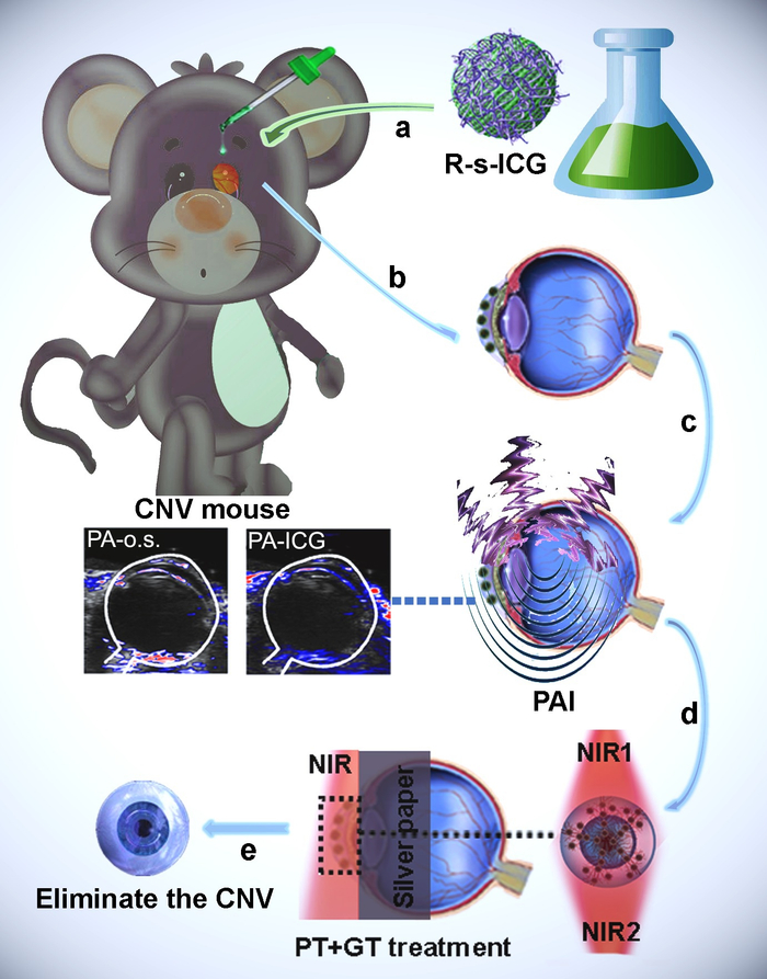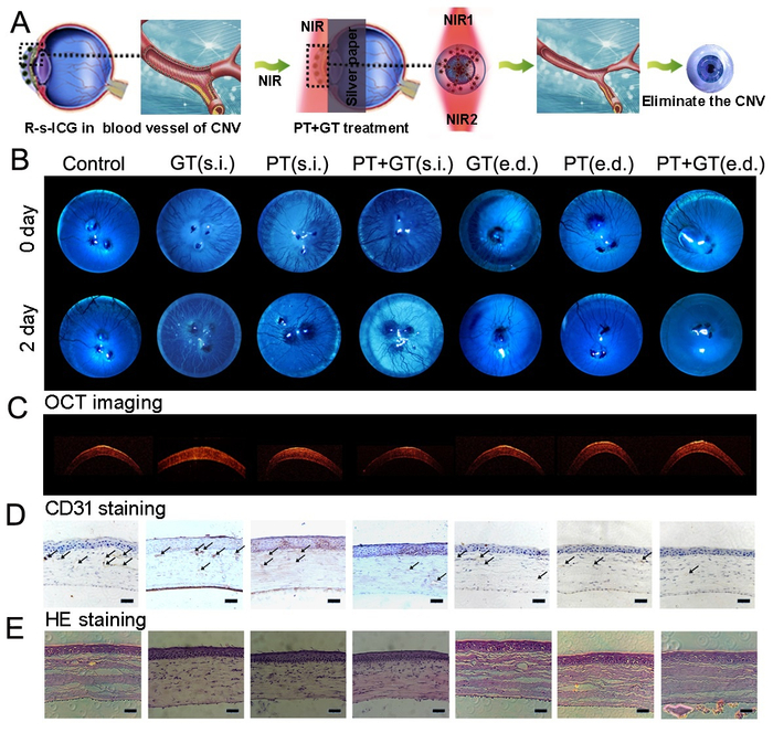 光照疗法是利用光动力和光热效应进行疾病诊断和治疗的一种新技术。其原理是目标组织吸收的光敏剂被特定波长激光照射受到激发,激发态的光敏剂能够释放大量热量和活性单态氧,通过高温和氧化反应产生细胞毒性作用,进而导致细胞受损乃至死亡。光敏剂吲哚菁绿(ICG)静脉注射联合光照已经应用于视网膜新生血管的治疗,但普通ICG在新生血管中富集率低、缺乏靶向性,因此疗效较差且易损伤正常眼组织。刘刚教授团队的前期研究发现,锌二甲基吡啶胺(DPA-Zn)能够与ICG高效结合后形成稳定的ICG纳米结构(nanoICG)。nanoICG相较于普通ICG具有更强的光敏性能、荧光强度、组织相容性和穿透力等。此外,nanoICG表面可修饰RGD多肽(R-nanoICG)以靶向新生血管,并可同时修饰siRNA以实现光照和基因协同治疗效果。