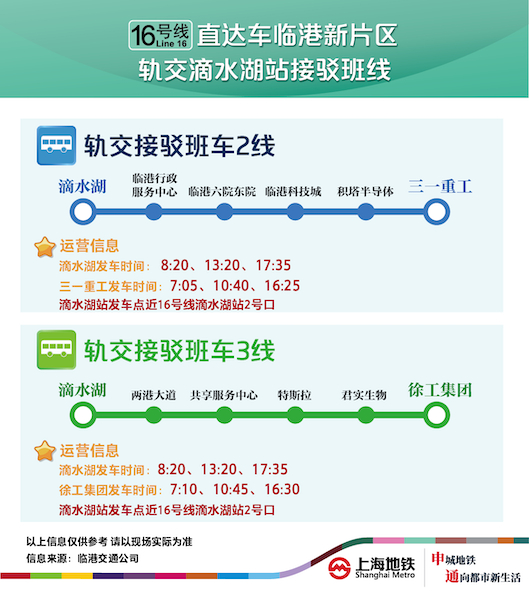 在临港新片区管委会的协调支持下,临港交通公司将在上班高峰时段新辟两条定制班车线路,从滴水湖地铁站到临港奉贤园区;接受扫码付款,后期将上线微信小程序等买票方式;票价3元,发车地点暂定为滴水湖地铁站2号口水芸路路口。