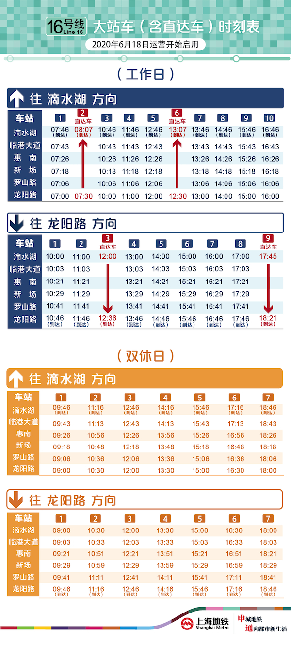 直达车7时30分、12时30分从龙阳路站发车,12时、17时45分从滴水湖站发车,全程仅需约37分钟,比普通车省时约20分钟,比大站车省时约9分钟,为线路增能,也为临港地区的发展提速增效。启用新方案后,16号线的大站车始发站发车时刻均调整为整点或半点,请乘客留意新时刻表。