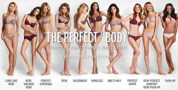 2014年维密发布了一则站着10位身材曼妙的模特的平面海报,广告语写着“THE PERFECT ‘BODY’”(完美身材),却受到了全英超过1.6万人的签名抵制。