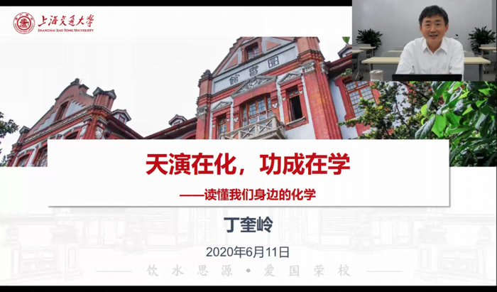 6月11日下午,上海交通大学党委常委、常务副校长、中国科学院院士丁奎岭走进“读懂中国”云端课堂,以在线教学的方式为近四百位本科生和研究生讲授“科学家精神:天演在化,功成在学——读懂我们身边的化学”,受到同学们的热烈欢迎。