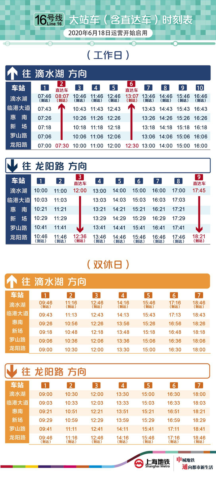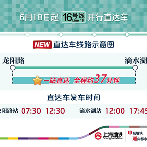 根据最新的列车运行方案,6月18日起,工作日时段16号线将开行4班直达车,分别是:【7:30】龙阳路站发车→滴水湖站;【12:00】滴水湖站发车→龙阳路站;【12:30】龙阳路站发车→滴水湖站;【17:45】滴水湖站发车→龙阳路站。16号线直达车仅停靠龙阳路站、滴水湖站两端终点站,途经站点均不停靠,直达车较普通车省时约20分钟,较大站车省时约9分钟。