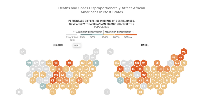 以威斯康星州为例,该州非洲裔人口占比为6%,而该州的新冠肺炎病亡病例中,非洲裔占比高达27%,明显高于其人口占比。这种情况在统计图中以橙黄色标记,情况越严重颜色越深。可以看到,无论是新冠肺炎的病亡病例,还是确诊病例,非洲裔的占比都要高出其人口占比。