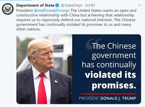 北京时间15日一早,美国国务院通过推特发布了特朗普针对美中关系做出的最新表态: