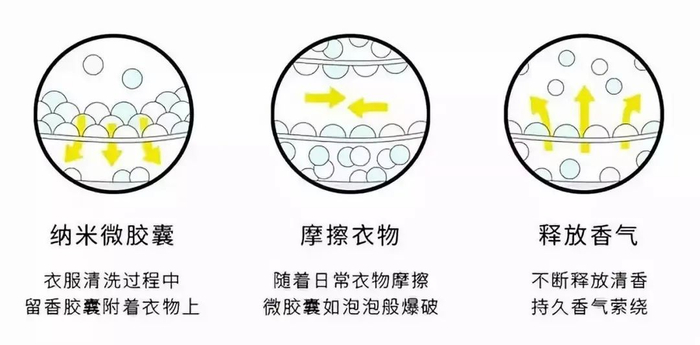 洗衣服时,微胶囊会牢牢吸附在衣服上。日常穿着时,随着衣物的摩擦,微胶囊就像泡泡一样被挤压爆破,不断向周围弥漫着自然的香气,仿佛自带的体香,举手投足间都散发着迷人的魅力。