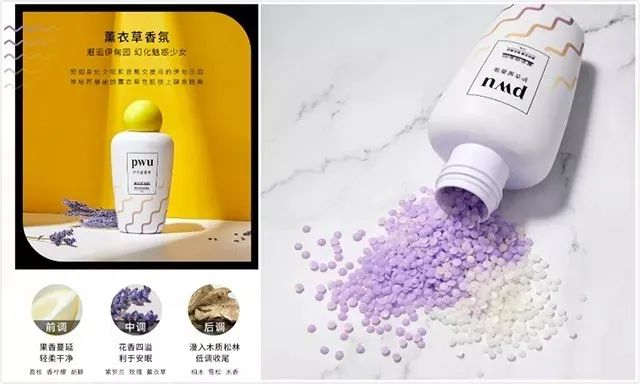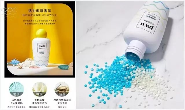 PWU 双色留香珠采用瑞士专利微胶囊技术,将香氛因子、植物精油等原料用特殊材料包裹起来,形成微胶囊颗粒。