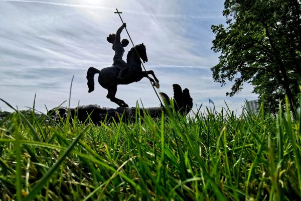 资料图:在位于纽约的联合国总部拍摄的“善战胜恶”雕塑。这尊雕塑是苏联1990年为纪念《中导条约》签署和联合国成立45周年特地赠送给联合国的,由销毁的苏联和美国导弹零件铸成,刻画了代表正义的英雄杀死恶龙的场景。新华社发