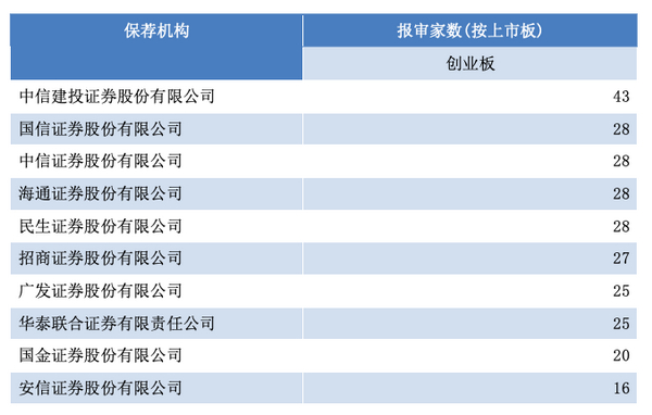 若不排除终止审查等情况,中信建投的创业板储备项目数量达43个,国信证券、中信证券、海通证券、民生证券均握有28个项目。