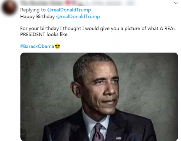 “生日快乐,特朗普。为了庆祝你的生日,我想应该让你看看真正的总统的样子。”有网友贴出了奥巴马的图片,并这样说道。