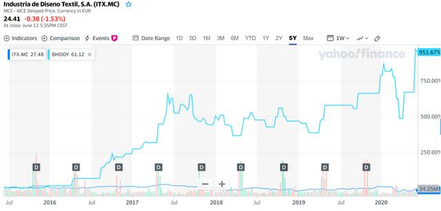 最近5年,Boohoo的股价涨幅大幅度领先于Inditex