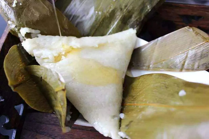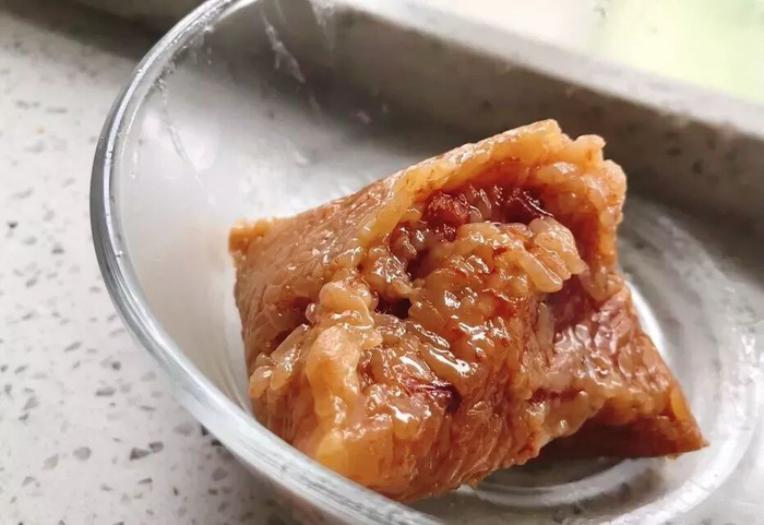 煮化的猪油渗透到每一粒米的间隙,油亮的糯米附着粽叶的清香,光是看着就觉的是好吃的样子。软糯的米粒虽紧密黏在一起却不烂糊,而且越嚼越香。