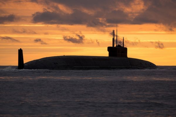 图为2018年5月22日,进行“圆锤”导弹齐射前的“尤里·多尔戈鲁基”号核潜艇。