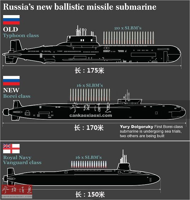 按理论计算,一艘北风之神级核潜艇发射的16枚“圆锤”弹道导弹可在半小时内毁灭地球上任意一个中等国家。图为俄海军新、老两代战略导弹核潜艇,北风之神级(前)与台风级(后)合影照。