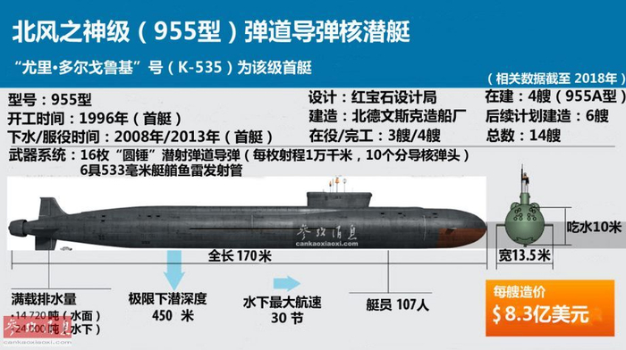 北风之神级核潜艇水下满载排水量2.4万吨,全长170米,全宽13.5米,吃水10米,搭载一台OK-650型压水核反应堆(与台风级相同),最大输出功率380兆瓦,驱动一台泵喷式推进器,水下最大航速30节。图为北风之神级数图,介绍了该级艇相关的各项性能。