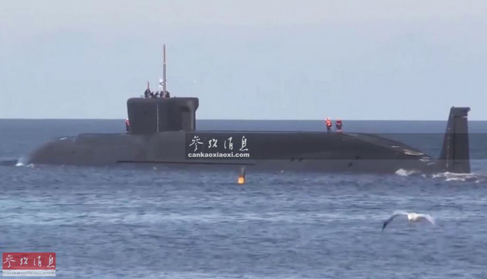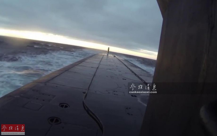 图为5月22日,尤里·多尔戈鲁基”号即将下潜入水,可见16个“圆锤”导弹发射筒保护盖。