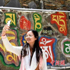 图为6月13日,游客在石刻碑文墙前自拍留念。 中新社记者 安源 摄