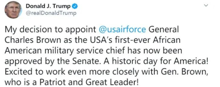 他颇为得意地说:“我任命的首位非洲裔空军参谋长获得了参议院的批准。对美国而言,这是历史性的一天!很高兴能与布朗将军更加紧密地合作,他是一位爱国者和伟大的将领。”