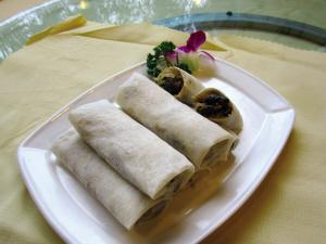 端午节家家还有吃薄饼的习俗。薄饼是采用精白面粉调成糊状,在又大又平的铁煎锅中,烤成一张张形似圆月,然后用绿豆芽、韭菜、肉丝、蛋丝、香菇等作馅,卷成圆筒状,一口咬去,可品尝到多种味道。