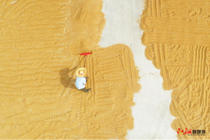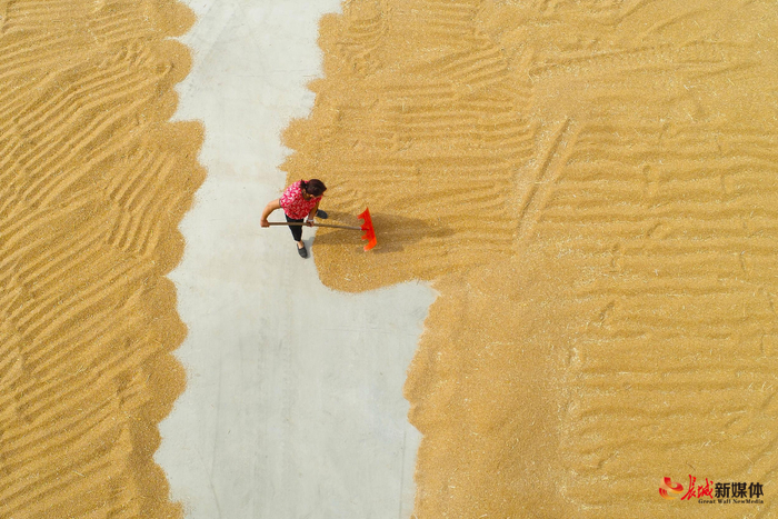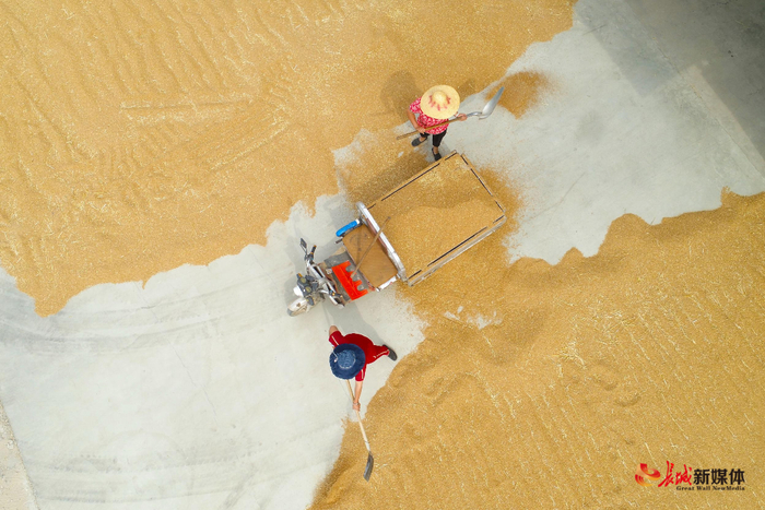 又到小麦收获季节,唐山市丰润区任各庄镇陶立营村农民抓紧时间晾晒收获的小麦,确保颗粒归仓。