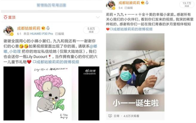 2020年5月,《成都姑娘》作者,法国波尔多中法形象大使Lily李莉娟(莉莉)在法国顺利产子,并取名为李一一(Louis Ducourt路易-都古鳄),寓意着十全十美,美满幸福,作为法国波尔多最大葡萄酒酿制酒庄DOUCOURT都古鳄酿酒家族的第七代继承人,也作为李莉娟的儿子,李一一(Louis Ducourt路易-都古鳄)从出生起就获得了数万书迷的祝福,书迷们不仅第一时间以视频形式送上了祝福,还以作画的方式庆祝新生命的诞生以及对他未来的美好祝愿。用莉莉(李莉娟)的话来说,是被数万小舅和小姨宠爱的孩子。